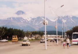 |  | ペドロハバロフスク・カムチャツキーの町から見えるアバチャ火山 何もないところだが、景色はすばらしい。日本へ続く火山列島のはじまりがここにあるのだと実感する。日本アルプスのをはるかにしのぐ山脈の連なりが遠くに見える。山が好きな人にはたまらないだろう。 |