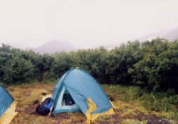 |  | もちろん登山もしました。何というのだろう、六輪駆動トラックを改装したバスのような車で、アバチャ火山の五合目まで登り、キャンプしました。あいにくの悪天候で頂上までは行けませんでしたが。ガイドが作っくれたボルシチがなかなかおいしかった。粉末のボルシチの素みたいなのを使っていた、どこかで手に入らないものかと今も思っています。 海岸からダケカンバがあり、600m位で樹木限界になります。 テントの回りはミヤマハンノキやハイマツです。 |